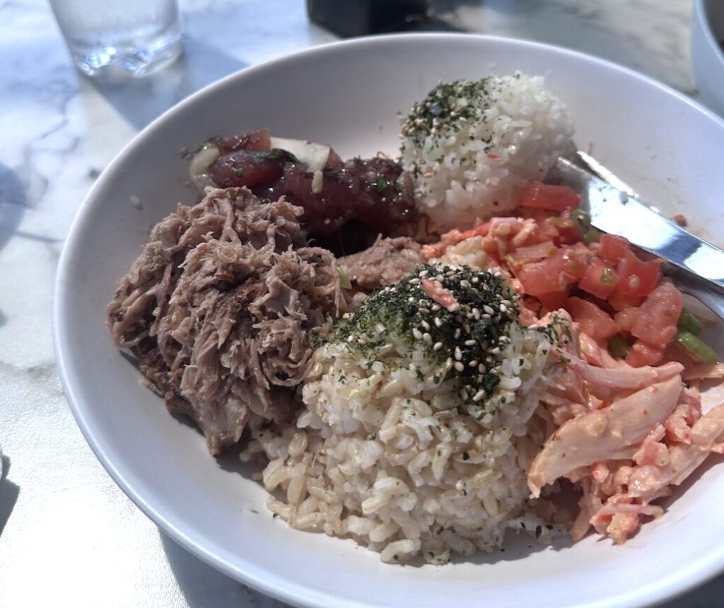 アイスコーヒーは果実味明瞭、酸は柔らかく、炎暑に適う。人気のポキ店にて、ポーク削ぎ身の丼を食す。テラスは好ましきも、周囲の景は混在。都市の陰影は隣り合わせなり。続いてコーヒー店に向かうも、アイスクリームは品切れ。代わりにココナッツオイル入りの濃厚な一杯を。腹に重く、後に気分優れず。苺のスムージーで整え、酸味が救いとなる。